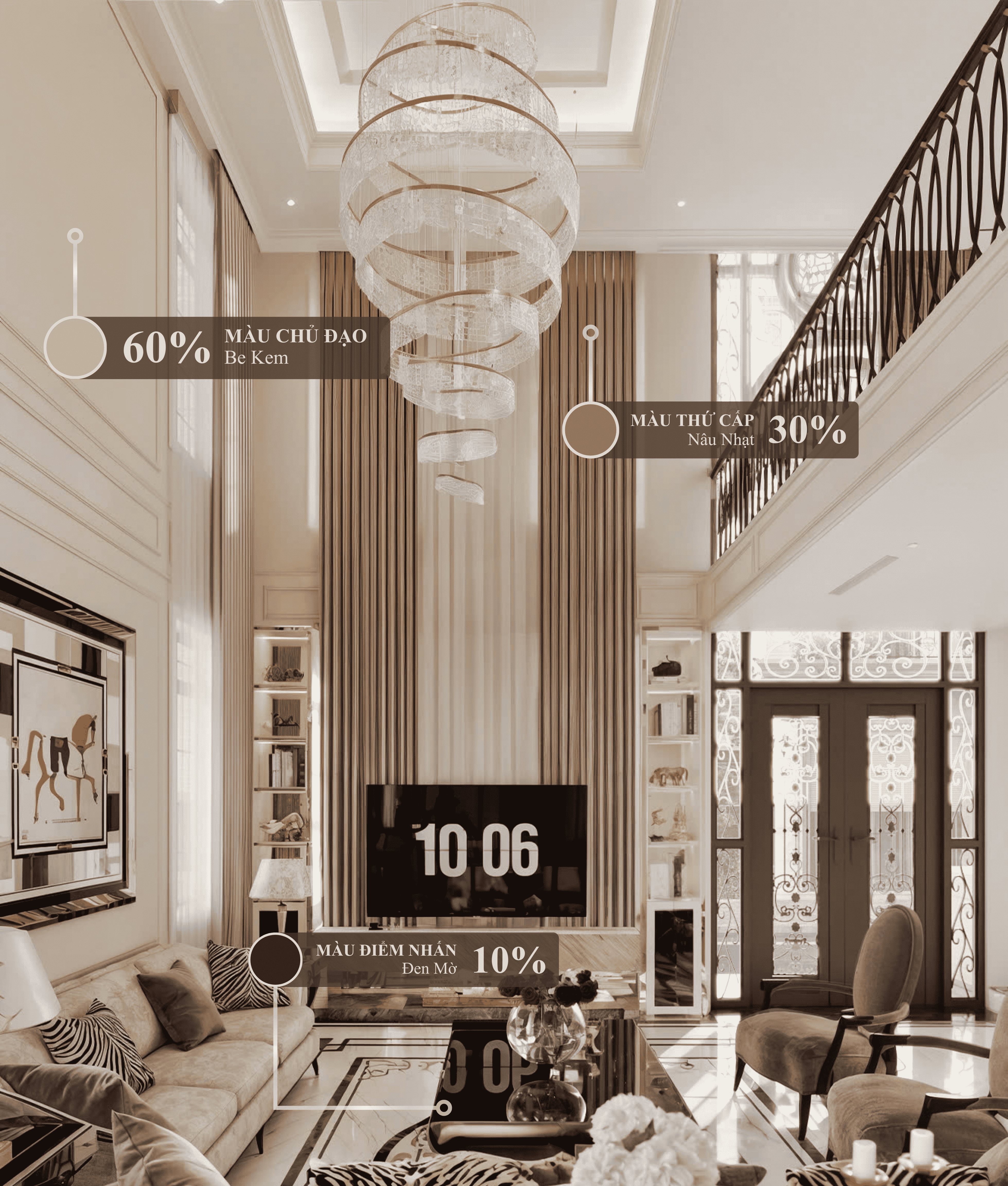 Đây là phương pháp phân bổ màu sắc trong không gian nội thất theo ba tỷ lệ chính. 60% dành cho màu chủ đạo, đóng vai trò là nền tảng liên kết không gian. 30% dành cho màu thứ cấp,tạo hình khối và chiều sâu. 10% còn lại dùng làm màu điểm nhấn, mục đích tạo tiêu điểm thu hút sự chú ý. Cách phân chia này giúp mắt người dễ dàng nhận diện trật tự không gian, từ tổng thể đến chi tiết.