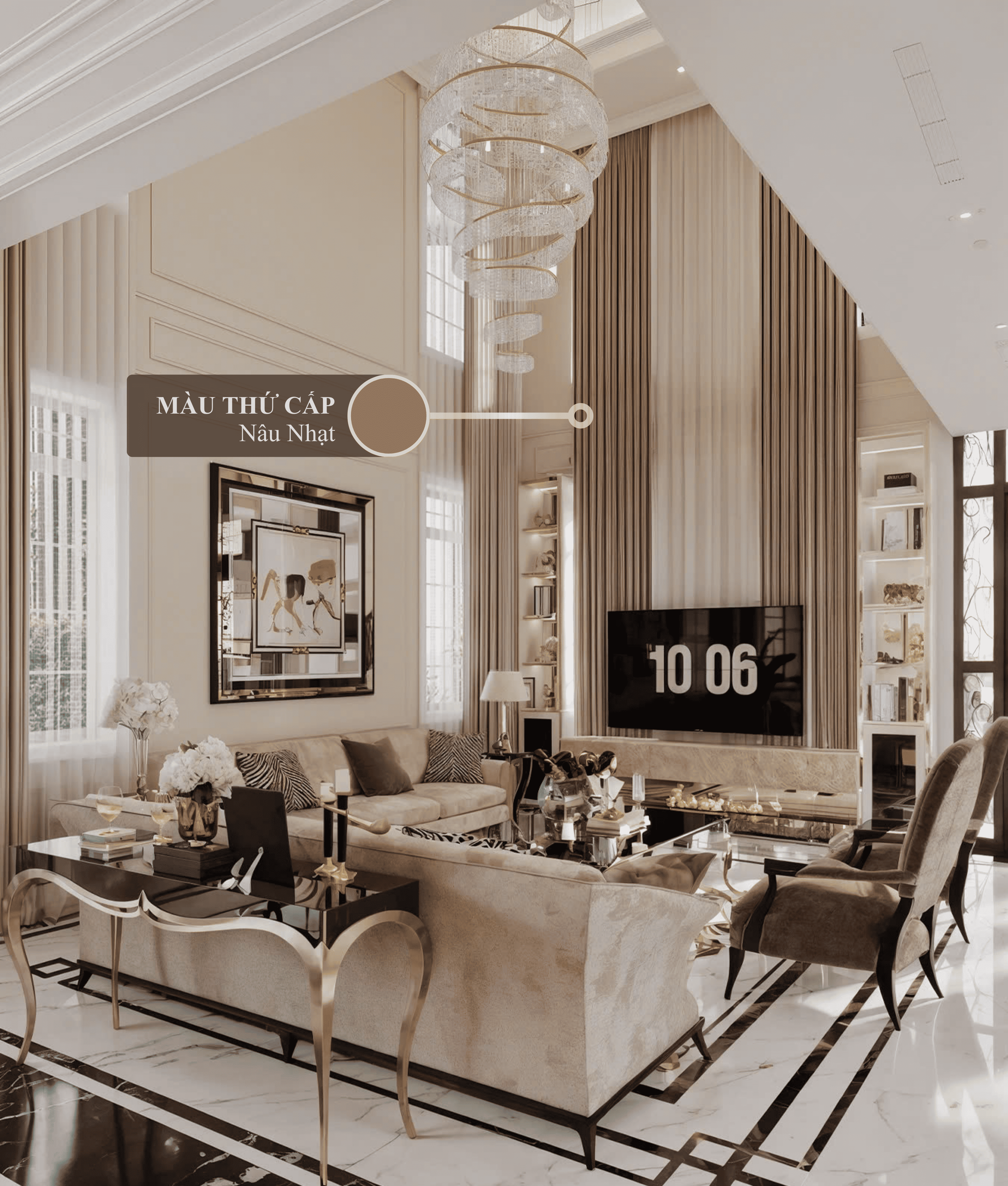 Sự cân bằng trong thiết kế Đây là lớp trung gian quan trọng giúp chuyển tiếp mượt mà giữa màu nền và các chi tiết trang trí nhỏ. Dưới góc nhìn chuyên môn, việc kiểm soát chính xác tỷ lệ màu thứ cấp giúp không gian trở nên sinh động, có hồn nhưng vẫn duy trì được trật tự kiến trúc chặt chẽ.